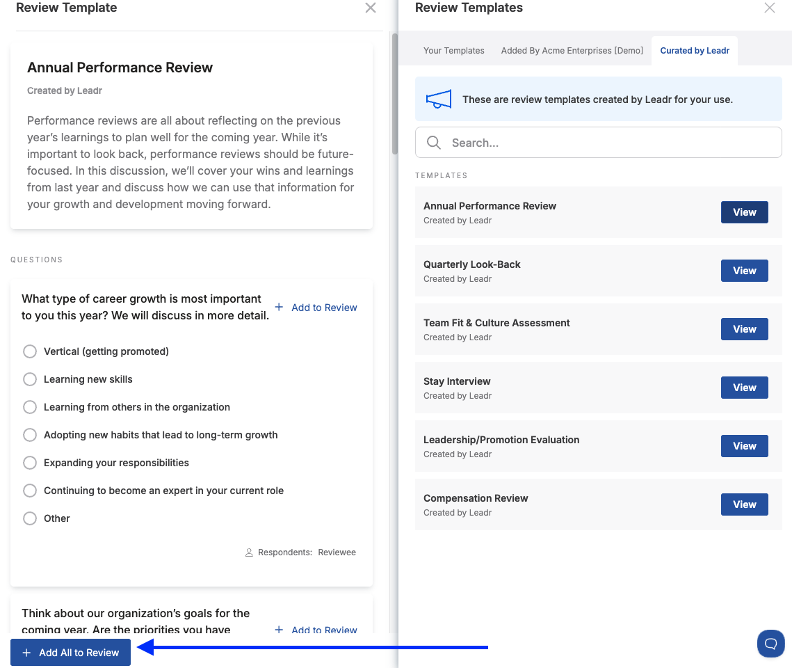After selecting a template, click Add All to Review. From there, you can add, edit, or delete questions as needed.