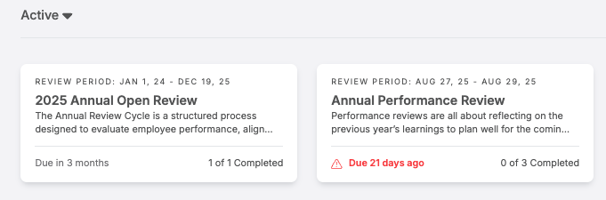 The review tile gives you a snapshot of the cycle; the review period, the due date, and the progress level of the Review.