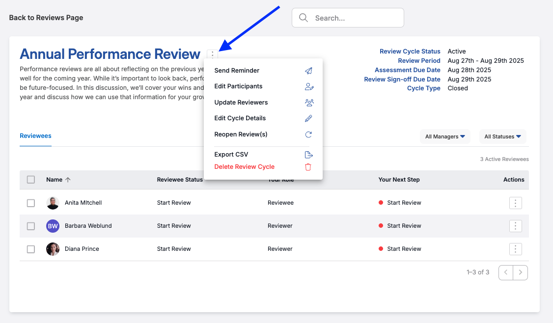 If you need to Send Reminders, Edit Participants, Edit the Cycle's Details, or Delete the Review cycle, simply click on the three vertical dots located next to the Title of the Review to utilize these options.