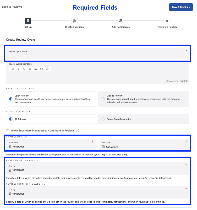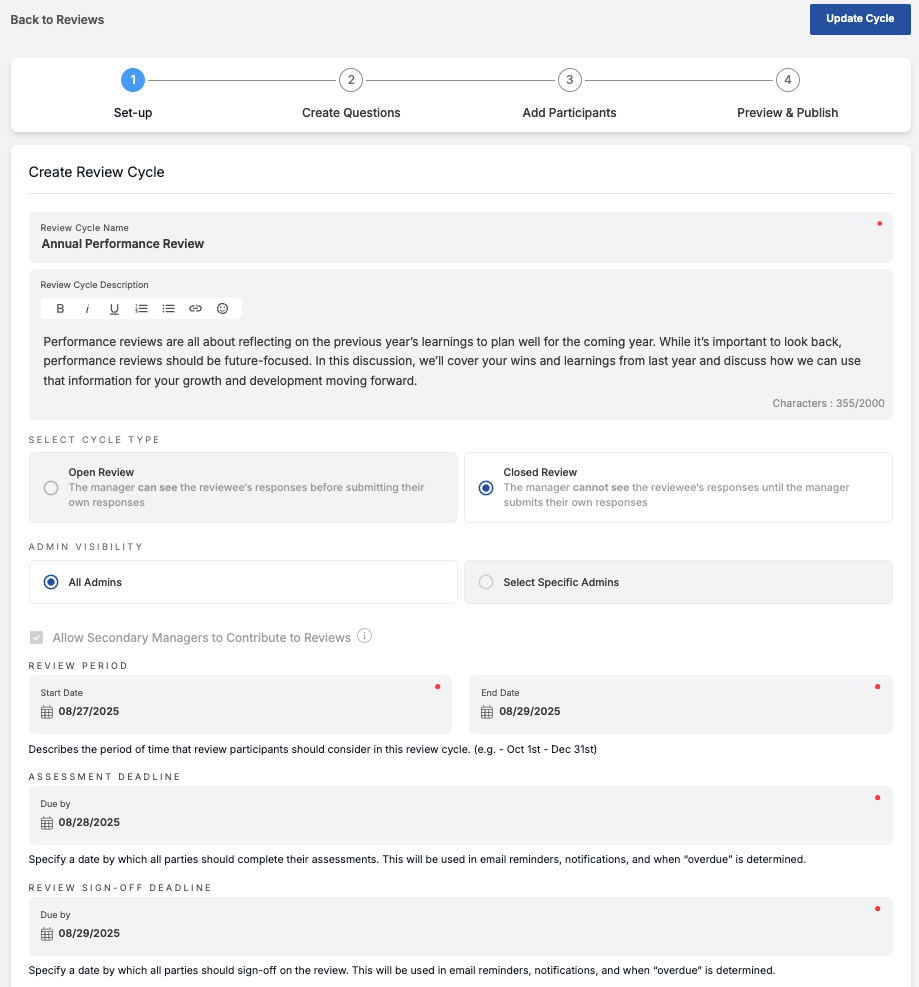 Manage the level of visibility that you would like for your Admin users to have.- Selecting "All Admins" will allow all Leadr users with Admin access to have visibility to this review cycle.