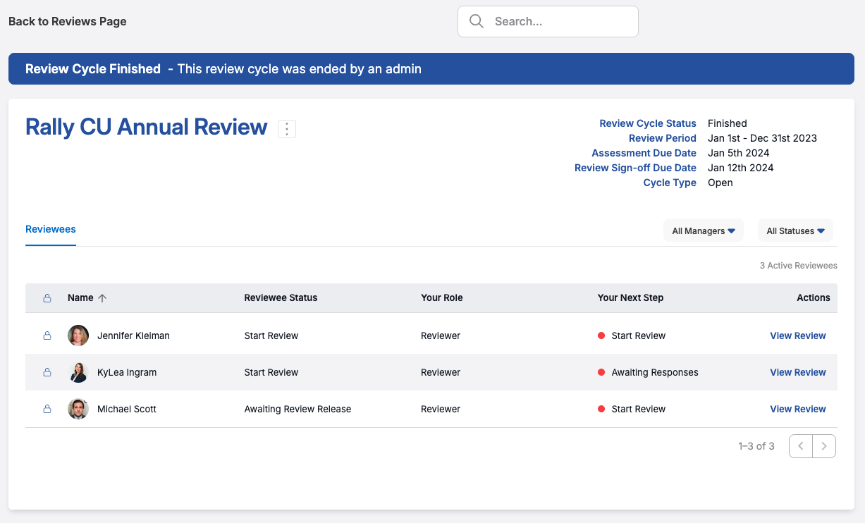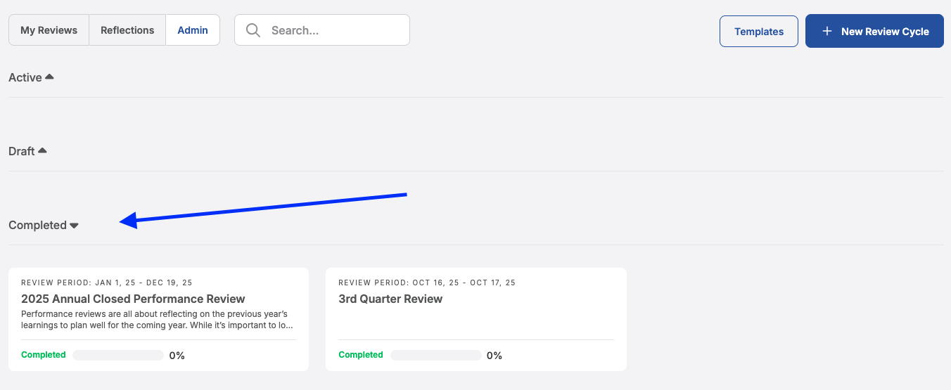 Please note, once a Review Cycle is closed by an Admin, the review will show as 'completed' for every participant within the Review Cycle, regardless of if their own review was completed.