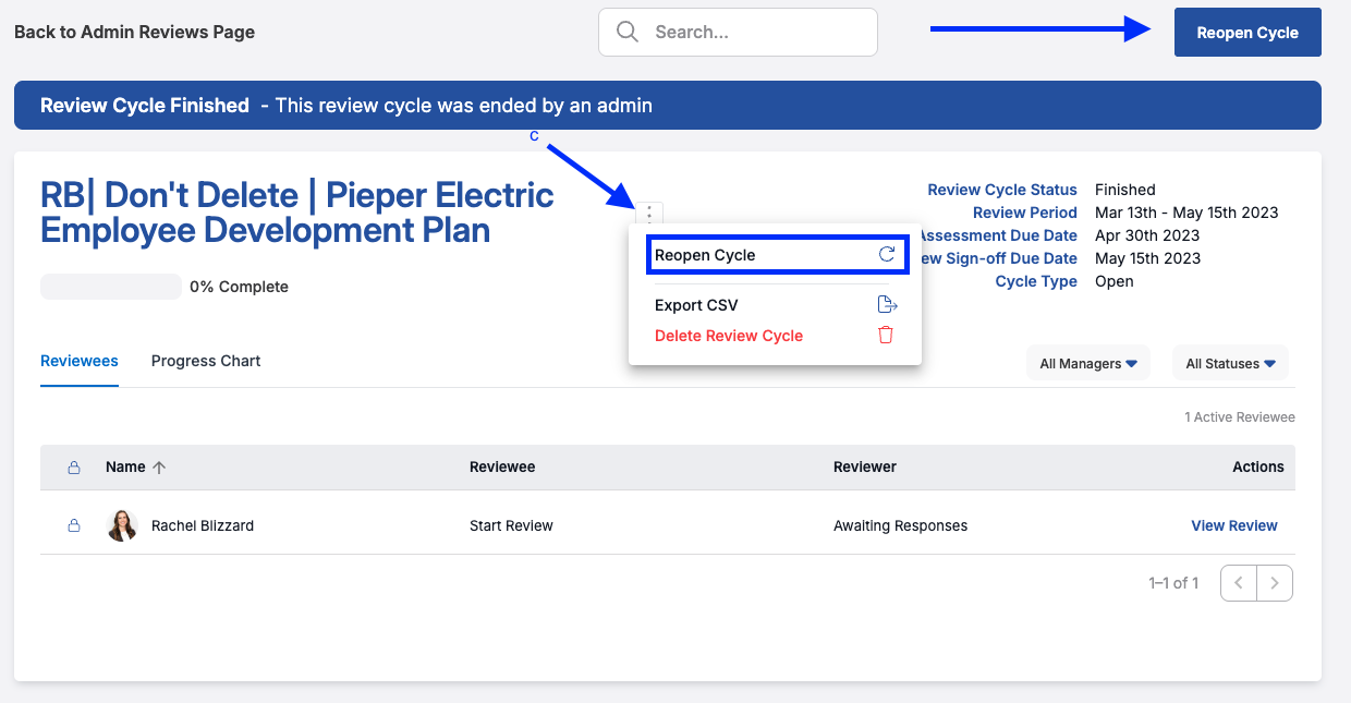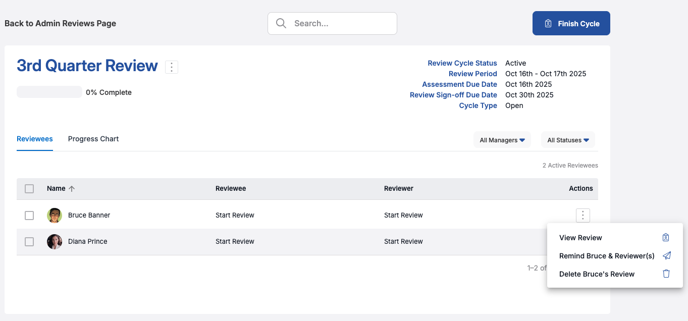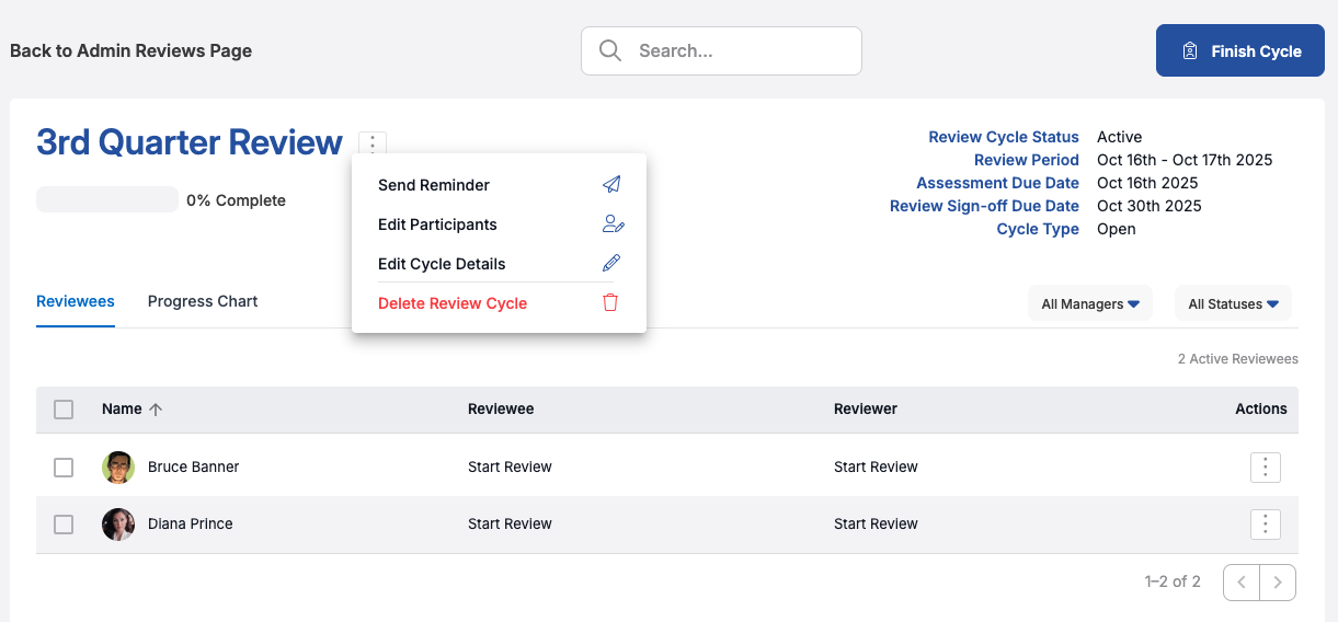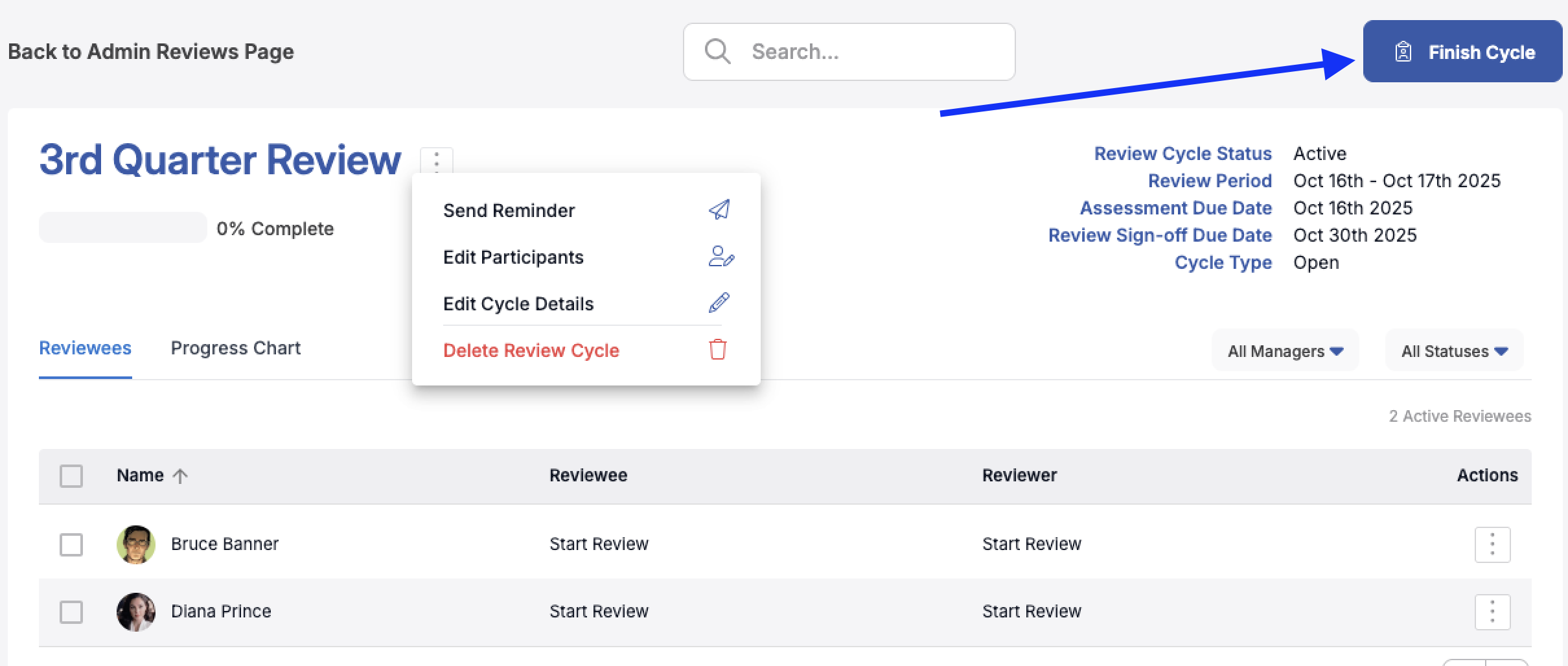 To complete a Review Cycle as an Admin, you will select the 'Finish Cycle' option to the top right corner of the Review Cycle page.