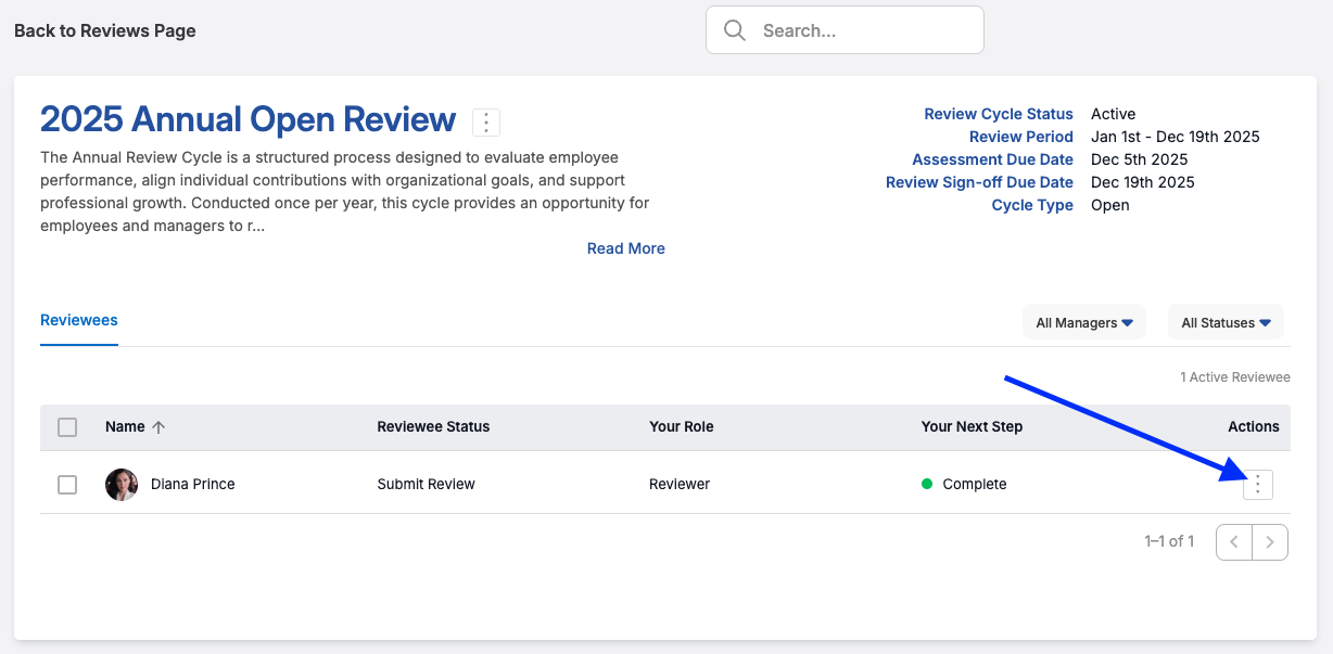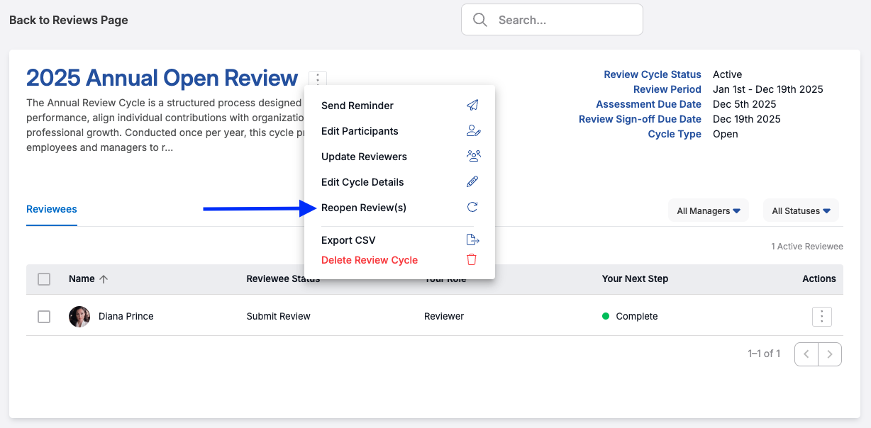 - Once you locate the Completed reviews, navigate to the closed Review Cycle that you need to re-open. Once you find this Review Cycle, click on it and you will see two ways to re-open the reviews. One option is at the top right corner of the Reviews screen and the other is through the three dots to the right of the Review title.