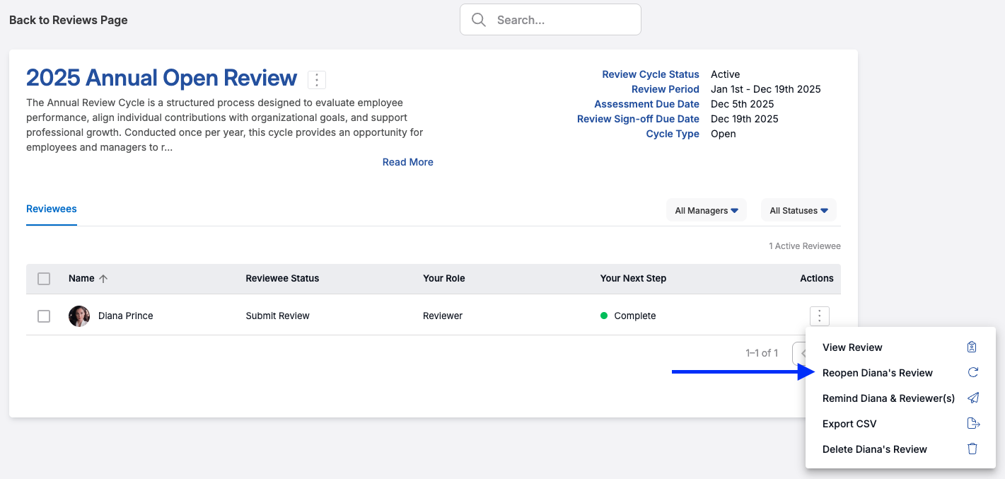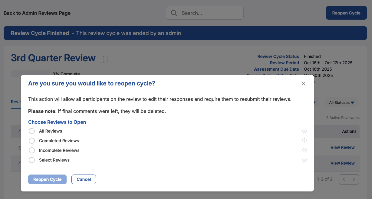 Please note, an individual review cannot be re-opened if the Review Cycle was closed out.