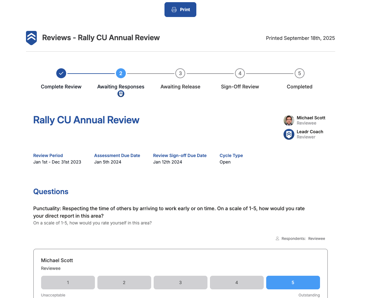 - Navigate to the Review Cycle that this review is in and click on the participant that you would like to print your review for. Once you are viewing this participants review, you will select 'Print Review' at the top right corner of the Review page.