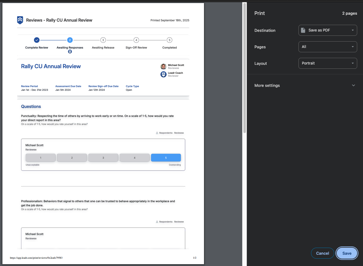 - You can also save the review cycle as a draft from this step so you can navigate away from the cycle and return to make edits later.