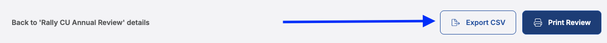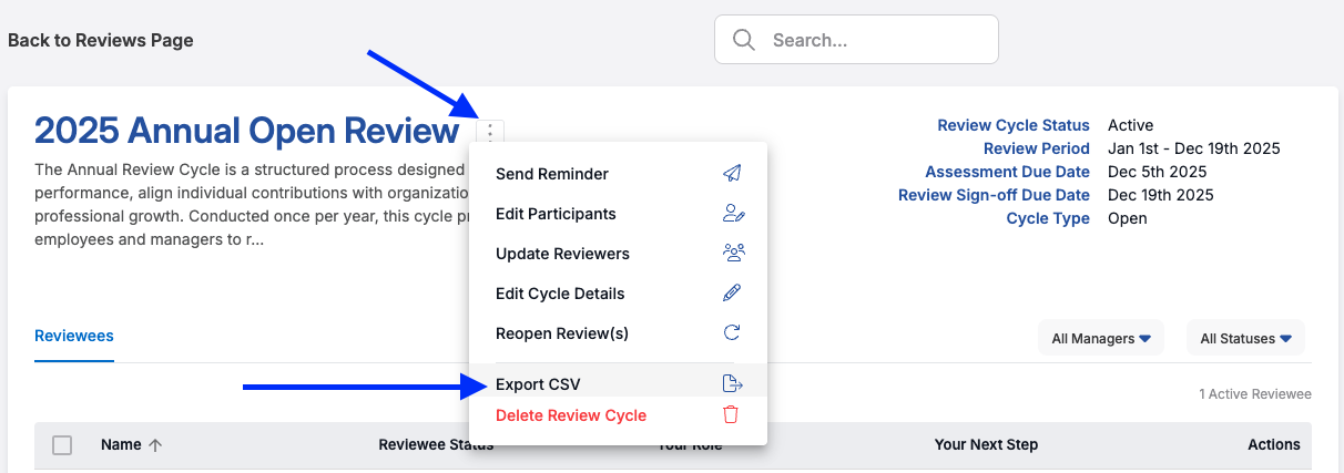 - Once you are in that Review Cycle, you can use the three dots next to the Review Title to select 'Export CSV'