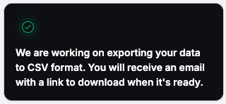 - Once you select 'Export CSV', a black confirmation bubble will come across at the bottom of the screen. If you are receiving a red bubble, please contact Leadr Support.