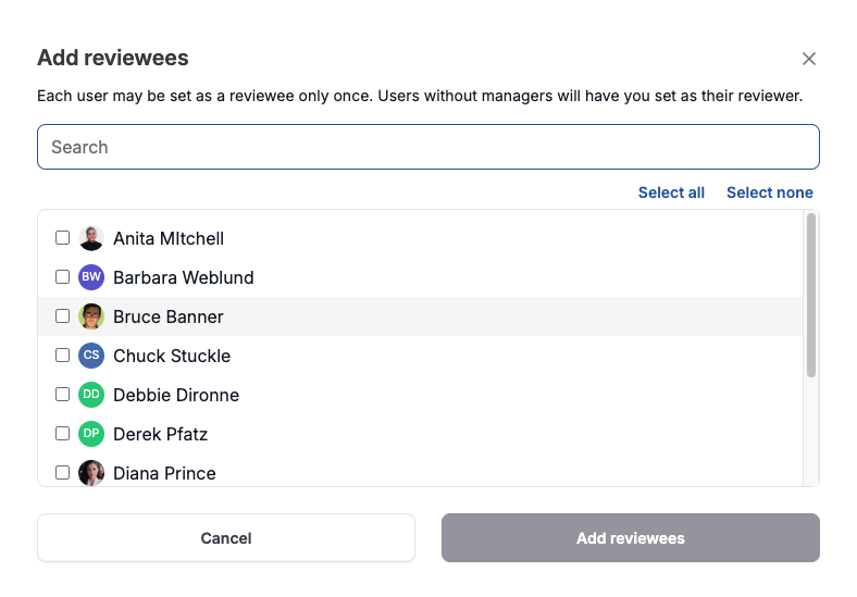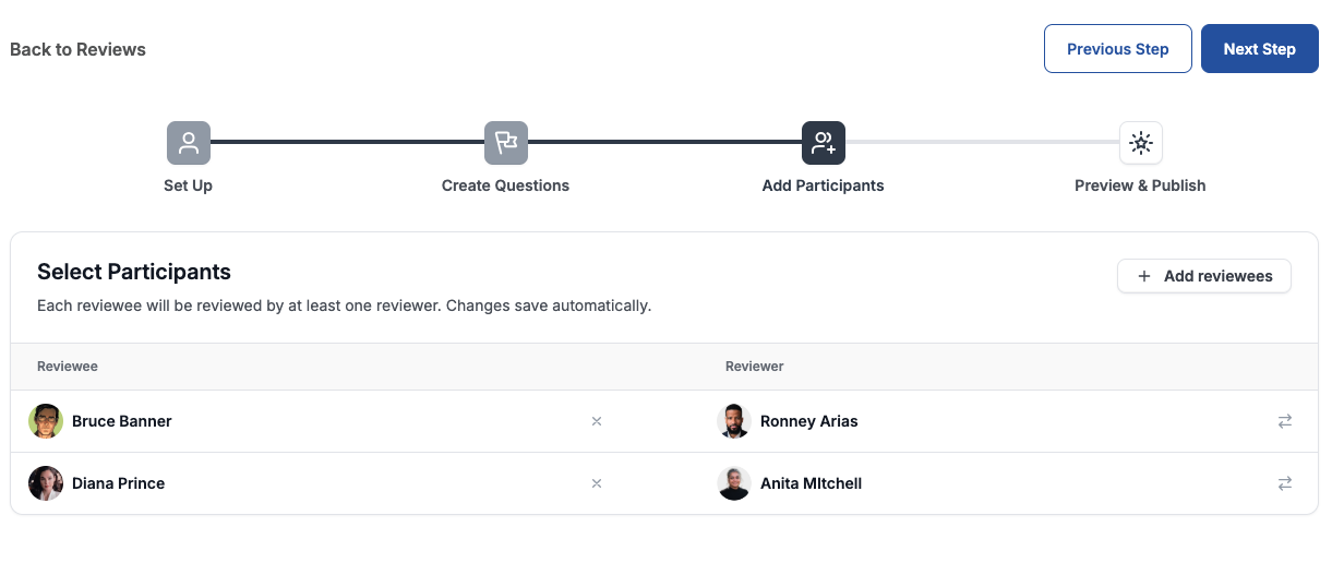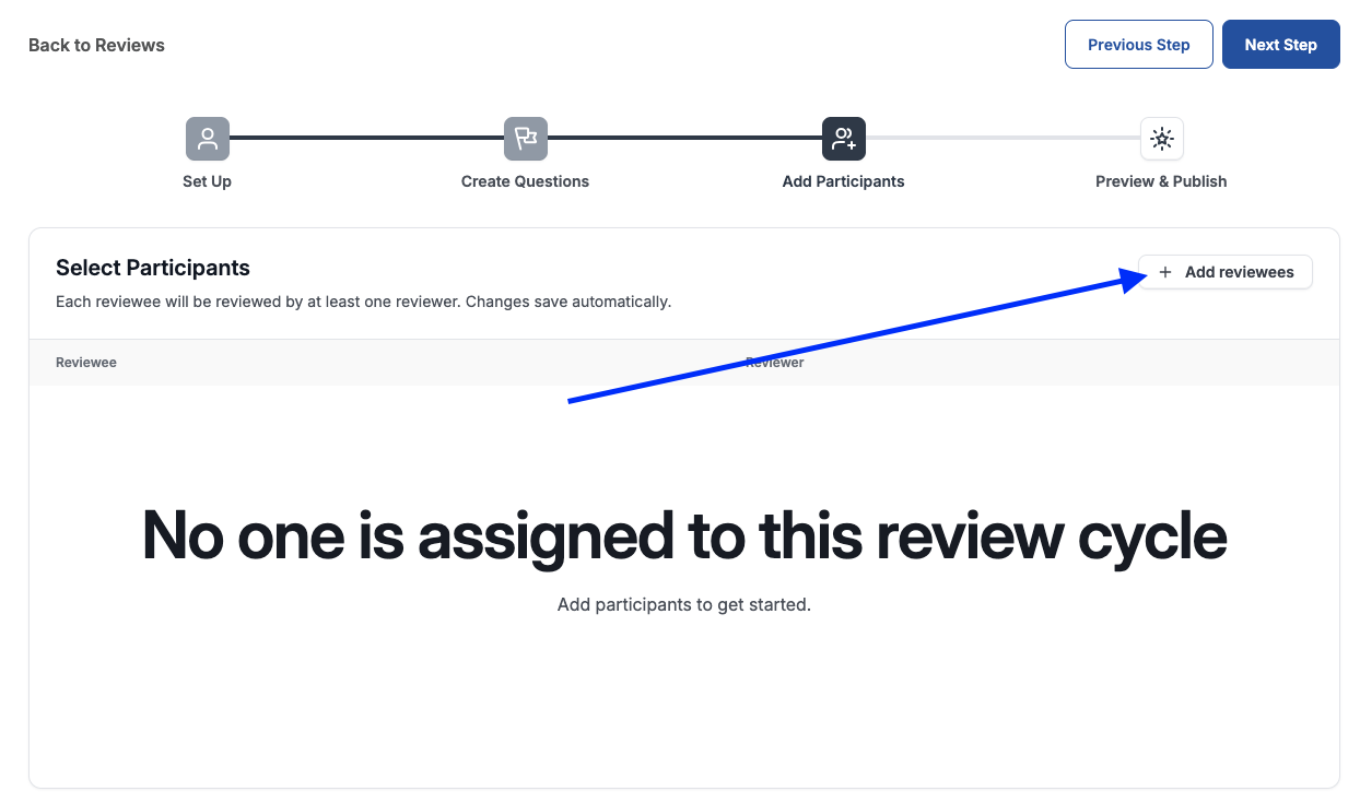 In order to publish a review, at least one person must be added to the review cycle. Our system automatically assigns the review to the direct manager of the participant included in the review cycle, as well as their secondary manager if that applies. You will only need to select the people who will be getting reviewed.