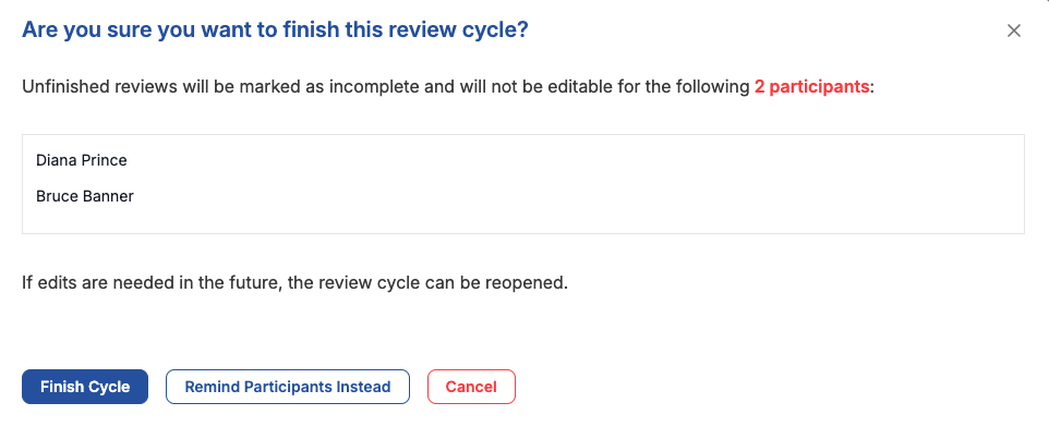 - Cancel: Keeps the Review Cycle open so you can return and close it at a later time.